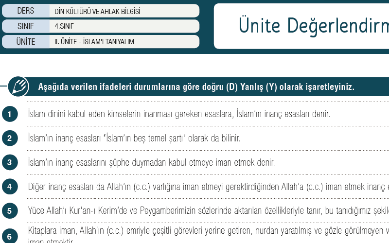 İslam'ı Tanıyalım - Ünite Değerlendirme Etkinliği (4. Sınıf 2. Ünite)
